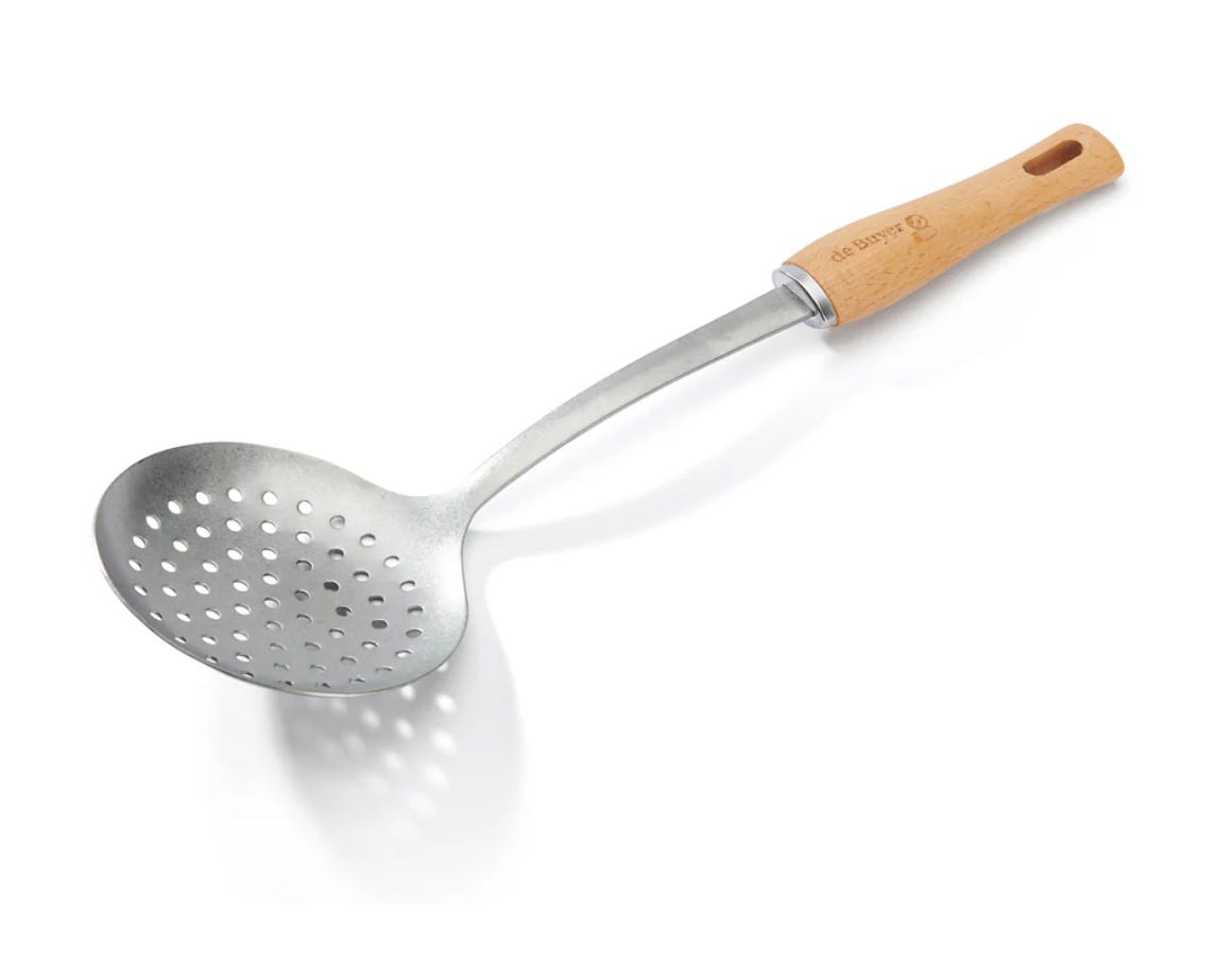 The kitchen is filled with the busy sound of water at a rolling boil. A SKIMMER SPOON is one of the most useful—and graceful—cooking tools you can have in your arsenal. Handy for extracting veggies, poached eggs, pasta and more from your pot, this implement lets you save your cooking water for a second round of use. Made by the venerable French cookware company du Buyer, founded in 1830, it’s also pretty enough to serve with thanks to the rustic stonewashed stainless steel spoon and beeswax-coated beechwood handle.