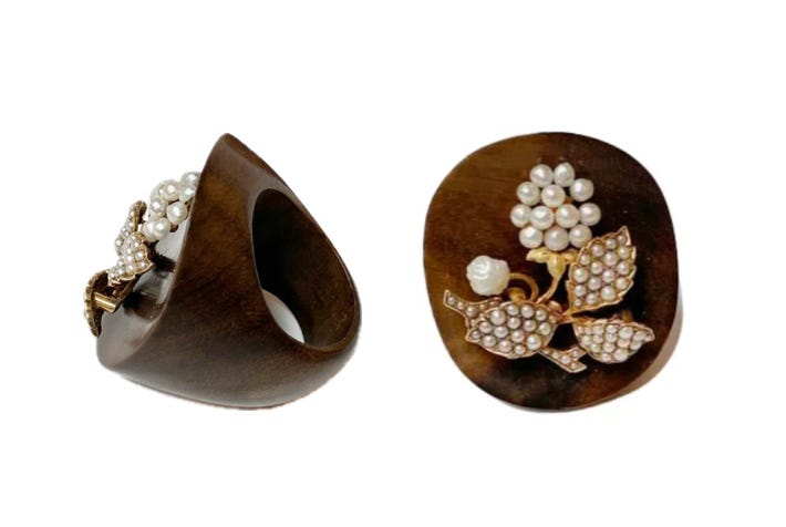 As you spear a bubbling escargot from its shell, you admire your ring finger in the warm candlelight. The perfect accessory for a cozy evening at your favorite new-old restaurant? DE VERA’S APPLIQUÉ WOOD RINGS, decorated with antique flower ornaments, adds an elegant fall feeling to the simplest of outfits and makes even a plaid shirt and cords dinner worthy. (And if snails aren’t your thing, this bauble also enhances the experience of drinking a gin martini.)